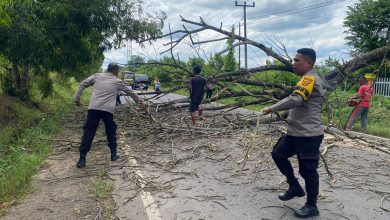 Baturaja- Personel Polsek Lubuk Batang Polres Oku bersama warga sekitar gotong royong membersihkan pohon tumbang yang menutupi jalan di depan…